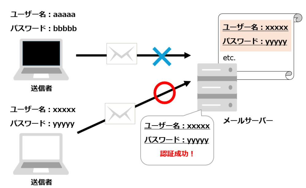 ESMTPでは「SMTP認証(SMTP AUTH)」という仕組みを使って、送信者が正しい人であるかを確認できます。これにより、なりすましや迷惑メールの送信を防ぐことができます。